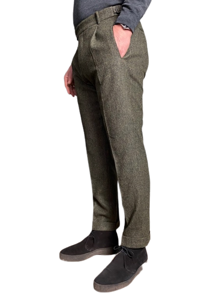 Ce pantalon en laine chevron olive présente un design impeccable avec des détails soigneusement pensés. Il dispose de pattes de serrage à la taille pour un ajustement optimal, de poches biaisées passepoilées de chaque côté pour une touche pratique, ainsi que de poches arrière passepoilées et boutonnées pour plus de fonctionnalité. Sa fermeture par braguette zippée et bouton à la ceinture assure un ajustement sûr, et le bas à revers ajoute une touche de sophistication.