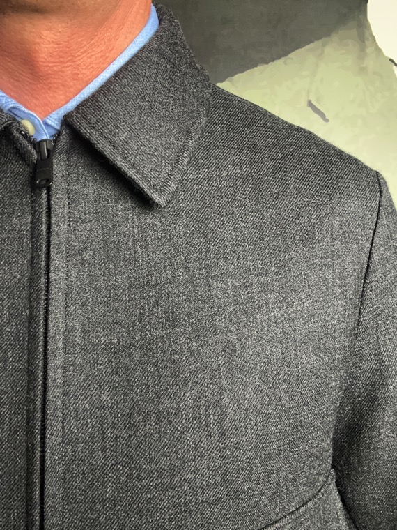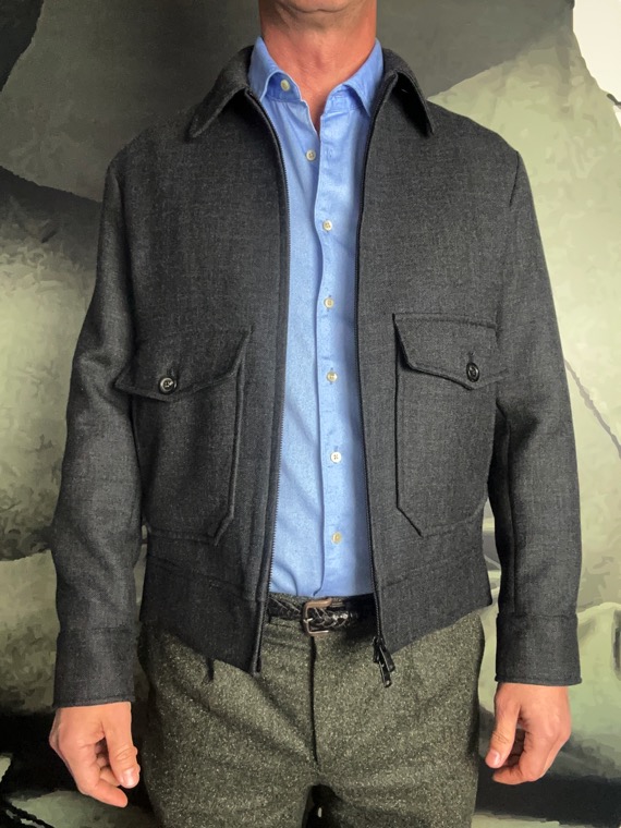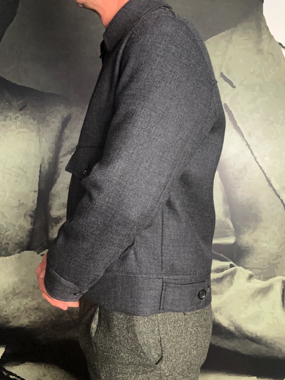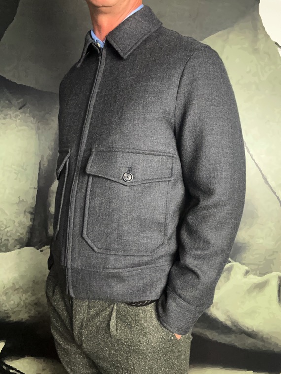 Blouson en laine 100% et doublure 100% coton. Deux poches plaquées à rabat fermés par un bouton. Fermeture droite par fermeture éclair. Col au cou, manches et bas boutonnées.
