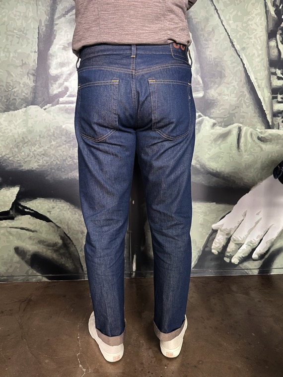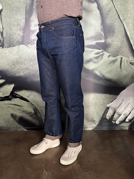 Jeans bray brut n’a aucun délavage, toile brut avec un reflet moiré. Coupe droite large. Braguette boutonnières. Souple.