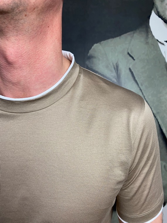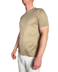 T-shirt fin à col rond, en coton mercerisé de couleur beige, contrasté par le coupé bord franc blanc au col,  manches et bas. Couture dorsale. Echancré de chaque côté.